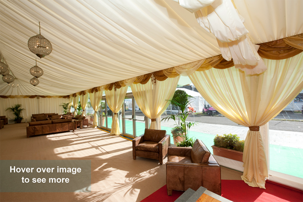 Decorative Linings from Custom Covers come in a range of styles, such as our traditional pleated linings and our more subtle flat linings, which provide a really clean look to the interior of your marquee. Our tent set of linings usually consists of roofs, hip-ends, walls, drapes and swags. These can all combine to give a classic and very popular finish to your structure. Custom Covers linings are modular, just like our structures, so that you can modify, add or remove various lining sections as you wish. See the gallery below for the various linings styles we offer, and have a look at additional decorative touches by clicking the button below. Our decorative touches include everything to make your event unique, from curtain reveals to window drapes.
